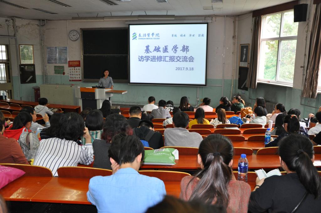 根据《BG大游官方网站教师培养培训管理办法》(长医政字[2015]36号)文件精神和人事处下发的《关于做好2016-2017学年访学进修汇报交流会的通知》要求,9月18日下午,基础医学部在北区第八阶梯教室组织全体无课老师和员工代表进行了访学进修汇报交流,听取了2016-2017学年基础部张丽娜、栗学清、宋少娟、赵娜、李莉娜等5位教师在外访学的汇报和经验交流。会议由基础医学部主任张翠英教授主持。