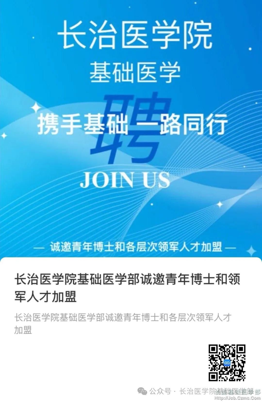 上述岗位常年招聘,有意向者请将详细的个人简历(含照片)发送至jcb@czmc.edu.cn,邮件标题请注明“基础医学部博士/高层次人才应聘”。
