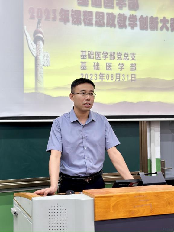 为扎实推进“课程思政”教学改革,挖掘和丰富专业课程育人内涵,推动教师课程思政教学设计水平的整体提升,8月31日上午,基础医学部2023年“课程思政”教学设计竞赛在北区第4教室举行。教务处处长韩玲娜教授、实验动物中心主任张雄鹰教授、党委人才工作部副部长王佳副教授、思政部张玮老师担任特邀评委。基础医学部党政领导及全体教师参加观摩。竞赛由基础医学部副主任原丽主持。