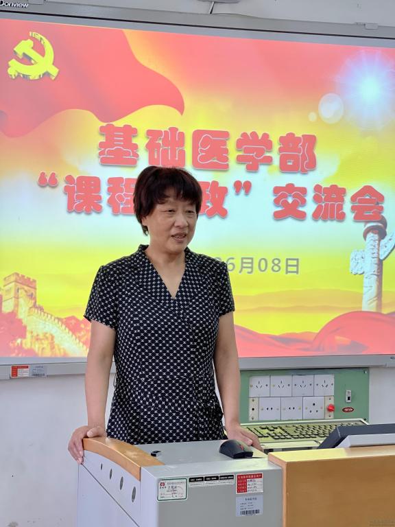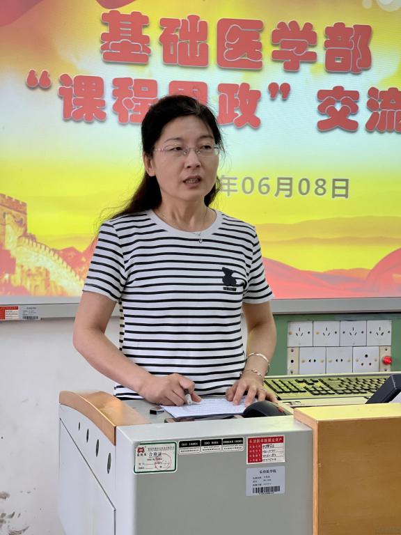 基础医学部党总支副书记曹燕飞强调,各位教师要强化专业课育人的思想自觉,加强对课程教学中思政元素的深度挖掘,提高课程思政育人能力;各科室要结合课程特点,分类推进课程思政建设,要真正坐下来讨论、群策群力,确保专业教育和思政教育两不误、两促进。