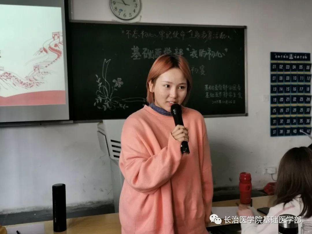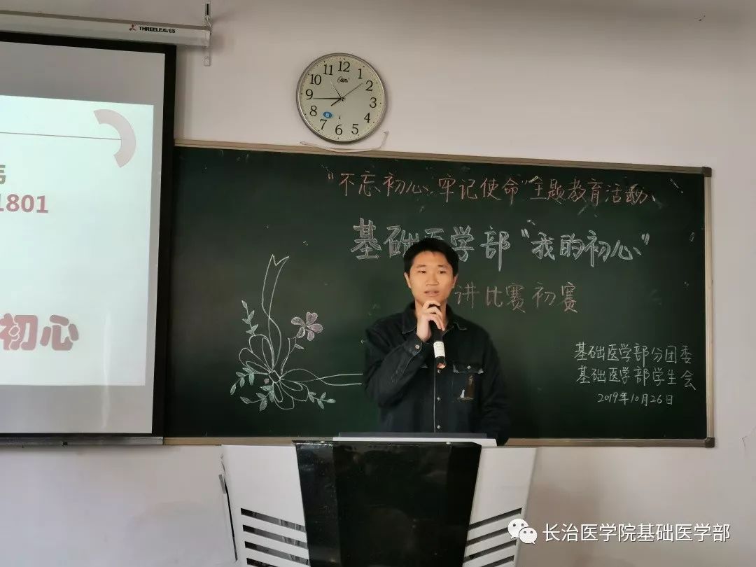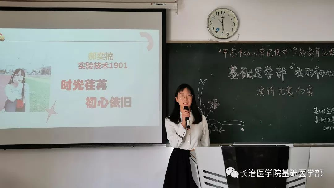 在“不忘初心、牢记使命”主题教育开展期间,为充分展现公司新时代青年员工昂扬向上、奋发有为的良好爱国精神风貌,端正青年员工思想作风,基础医学部特于10月26日早在北区24教举办“我的初心”主题演讲比赛初赛。担任本次活动的评委有基础医学部员工会主席李爽,副主席程玉洁,社会实践部部长曹淑华,特邀嘉宾田丽。